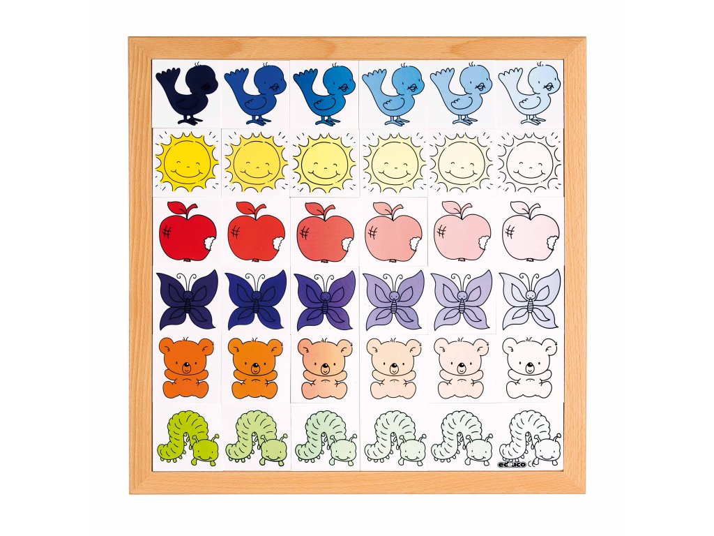 The changes on the image cards are based on value and hue. Ask children which image is more attractive, has clearer details or stands out more to them. Children arrange matching cards from darkest to lightest. This game encourages children to understand gradations of hue and the impact it has on images. Contents: 36 plastic image cards wooden frame (40 x 40 cm)Doplňkové parametry