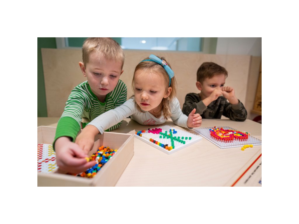Create figures of the assignment cards or create your own figures. Children practice the pen grip. This prepares them for writing. Eye-hand coordination, precision, concentration, and a sense of colour and pattern are practised and stimulated.Contents:•2 bead boards (1 white and 1 transparent)•540 plastic beads•6 task cards•wooden box (33,5 x 22,5 x 7 cm)Doplňkové parametry