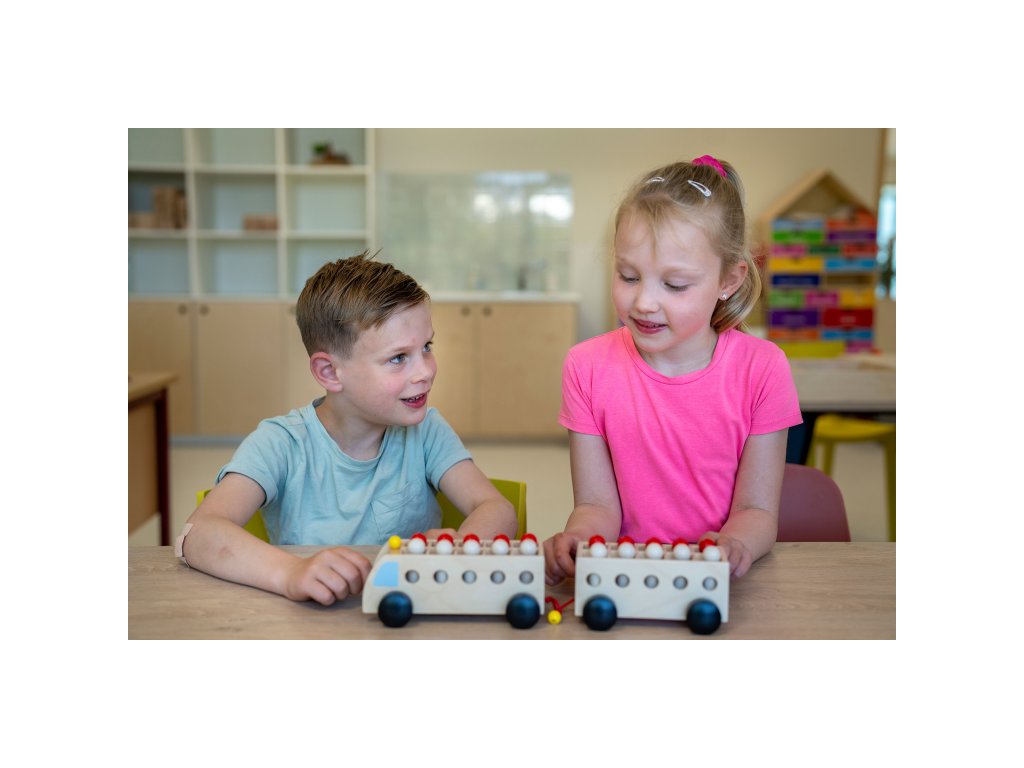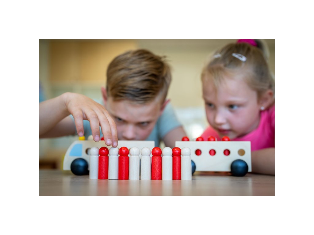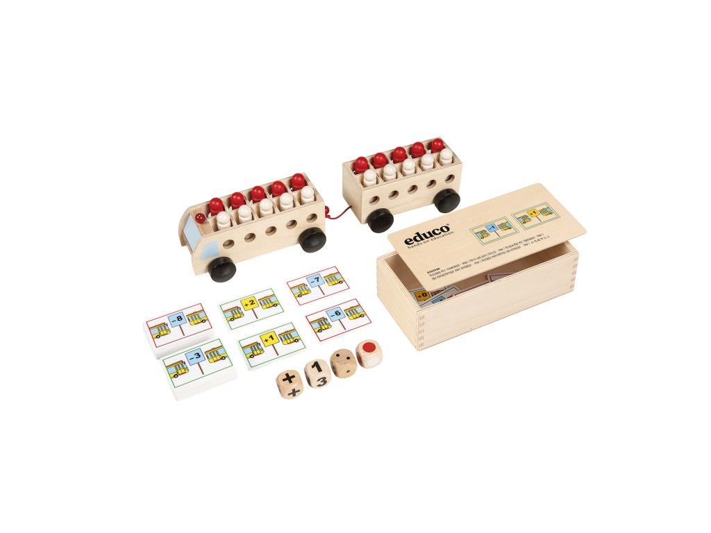 Small version of the counting bus. Ideal for small group work and remedial instruction. Create situations with the large counting bus to introduce counting, adding and subtracting up to 20, let children act out these situations individually or in pairs using the small counting bus. Contents: wooden bus (35 x 7 x 7 cm) 20 passengers in 2 colours 22 plastic assignment cards (7.5 x 5 cm) 4 wooden dice (2.5 x 2.5 cm) wooden box (24 x 12.5 x 7 cm)Doplňkové parametry