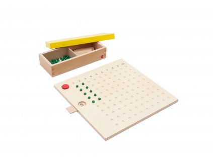 The Multiplication Board is used for practice with the multiplication tables 1x1 through 10x10. The material consists of: a) a wooden board with 100 cavities of 10 rows of 10, with numbers from 1 to 10 printed at the top and a window on the left side of the table; b) a wooden box with two compartments and yellow lid containing 100 green beads, number tags from 1 to 10 and a red token.Doplňkové parametry
