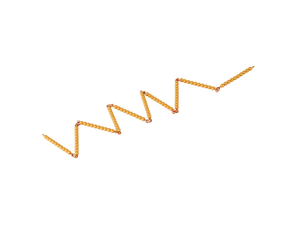 Zlatý perlový řetěz složený ze stovky perel umožňuje získat zkušenost s počítáním od 1 do 100, upevňuje zapamatování posloupnosti číslic, připravuje dítě na počítání po desítkách ad. Materiál doplňuje Sada šipek s čísly (# 0079B0). Řetěz lze uchovávat v Rámu (# 0079A0).Doplňkové parametry