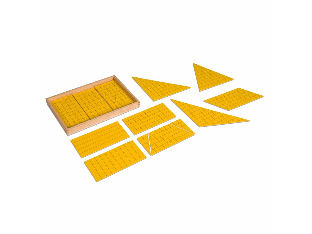 Materiál slouží jako úvod pro výpočet obsahu. Obsahuje dřevěnou krabičku s 20 žlutými trojúhelníky a obdélníky.Doplňkové parametry