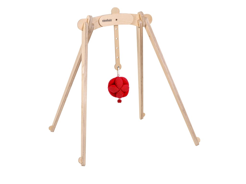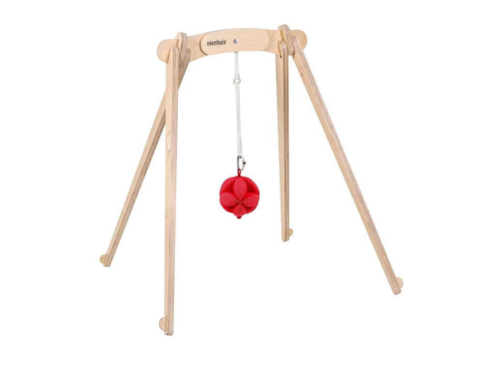 Based on a Japanese designed soft ball, The Montessori Kicking Ball is an easy to grasp textured fabric ball approx 15 cm in diameter. It is made of 12 wedge shaped cushions sewn and stuffed with soft filling (9x5x5 cm) then connected together at the ends where triangles are formed. At the bottom of the ball, a bell is firmly and safely attached. Designed to stimulate leg movement and produce repetitive sound, The Montessori Kicking Ball is hung by ribbon near the infant's legs and feet at a height where it can easily be kicked by the child.