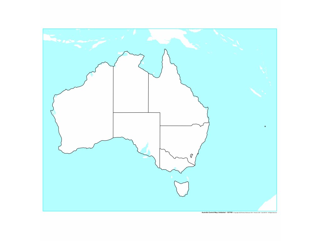 Mapa s nepopsanými státy Austrálie. Lze používat s materiálem Puzzle – Austrálie (0176J0), Kontrolní mapa Austrálie (557600), Popisky – Austrálie (556100).