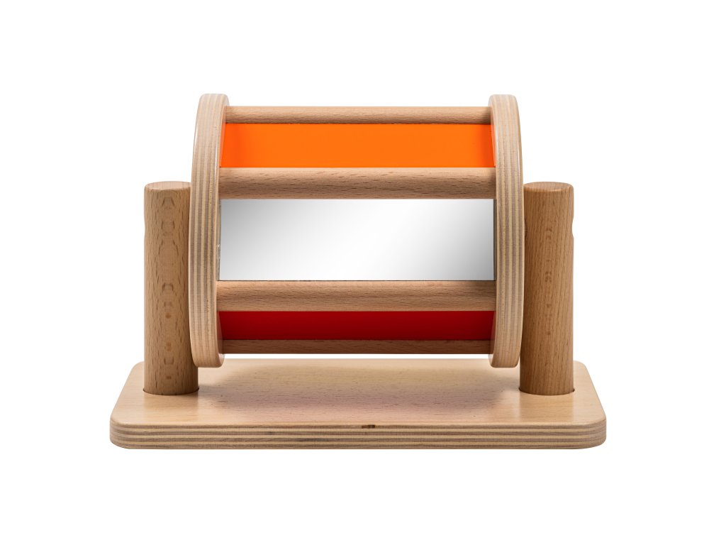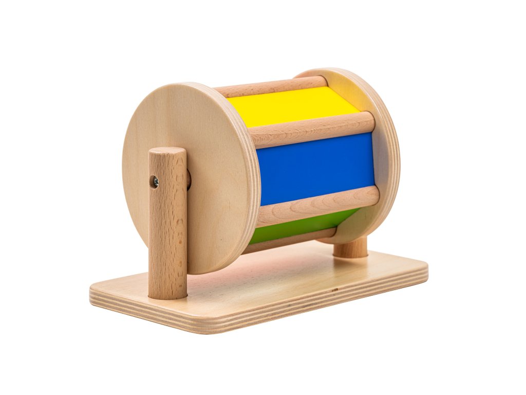 The Spinning Drum is a classic Montessori material for infants aged 6 months and up. The material consists of a wooden drum with several panels of differing bright colors - one with a mirror-like surface. Through play, the child is mesmerized by the beautiful bright colors, and fascinated upon seeing their own face in the drum. These activities help refine visual development, and the soft soothing sound created when the drum is spun stimulates auditory sensory formation. Hand-eye coordination is improved, as is core muscle strength, fine and gross motor skills, and the understanding of cause and effect.