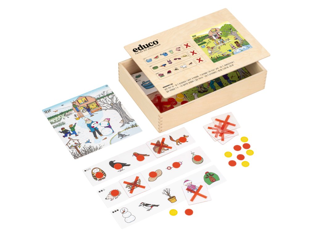 Který z předmětů zobrazených v zadání není na tématickém listu? Tématem jsou 4 roční období a zachycuje život jedné rodiny během nich. Děti se naučí jednotlivé období rozeznávat a pojmenovat je. Třídí odpovídající předměty a vylučují ty, které k sobě nepatří. Složitost zadání se stupňuje. 1. stupeň se skládá z obrázků, které jsou všechny přítomné v zadání. 2. stupeň obsahuje obrázky, které lze částečně najít v zadání, jako například koloběžku, kterou v zadání vidíme celou, ale na tématickém listu je zpola schovaná za stromem. 3. stupeň se skládá z obrázků, které jsou na tématickém listu, ale hůře se hledají, protože jsou menší, nebo mají jiný tvar. Jako například šedá kočka, která je v zadání zobrazena celá, ale na tématickém listu se schovává kupce listí a vidíme tak pouze její ocas. Položte žetonek na ty obrázky, které jste již našli. Průhledné kartičky s písmenem "x" patří k obrázkům, které nejsou na tématickém listu. Na zadní straně zadání je správné řešení. Tato pomůcka cílí jak na jazykové, tak na matematické schopnosti. Do matematické části patří třídení, vyřazování a 4 různá časová údobí. Tématické listy lze použít jako podklad k vyprávění si. Jak se různá roční období projevují v domě, na zahradě a v rodině? Co dalšího můžeme pozorovat? Pomůcka obsahuje 4 plastové tématické listy (20 x 20 cm), 12 12 plastových kartiček se zadáním (30 x 6 cm), 12 průhledných plastových kartiček s písmenem "x" (6 x 6 cm), 50 plastových žetonů, návod, dřevěnou krabici (33,5 x 22,5 x 7 cm)Doplňkové parametry