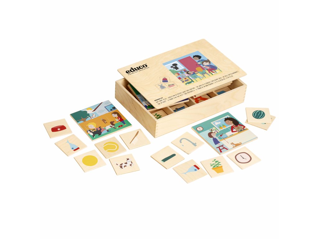 Prohlédněte si tématické listy a povídejte si s dětmi o tom, co vidí. Také se koukněte na obrázky na kartičkách a pojmenujte je. Děti se tak naučí význam základních slov a pochopí, v jakém kontextu se používají. Tématické listy zachycují situace odpovídající zkušenostem a zájmům batolat, které se například rády dívají na to, co dělá maminka a tatínek. Dobře známé jim bude vaření, příprava na spaní, praní, uklízení, chození do školky, nakupování a zvířata. Dřevěná krabice je rozdělena na 8 částí, takže lze kartičky tématicky seřadit. Tato pomůcka má dva cíle: procvičování jazykových a matematických schopností. Jazyk procvičíme díky tématickým listům, které lze použít jako základ vyprávění a také díky kartičkám s obrázky, které lze pojmenovávat. Matematické schopnosti jsou rozvíjené díky třídění kartiček dle situací a děti se zároveň naučí jak si utřídit poznatky. Pomůcka obsahuje 6 dřevěných tématickcýh listů (14 x 14 cm), 36 dřevěných obrázkových kartiček (7 x 7 cm), dřevěnou krabici (33,5 x 22,5 x 7 cm).Doplňkové parametry