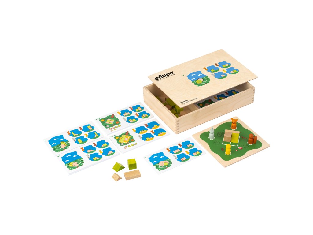 What do the animals see? Take an assignment card and reconstruct the building on the game board. Now there are two options for play. Look carefully and where necessary turn the board, then place the animals in the right place. Or: first place the animals in the indicated location. From all sides look at what they see and construct the building. Develop fine motor skills, visual memory and spatial insight. Contents: plastic game board 4 wooden animal figures 16 wooden blocks 24 assignment cards wooden box (30 x 21 x 6 cm)Doplňkové parametry