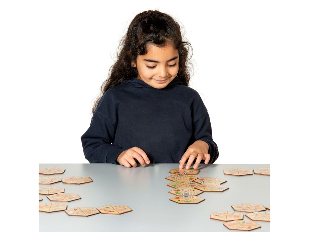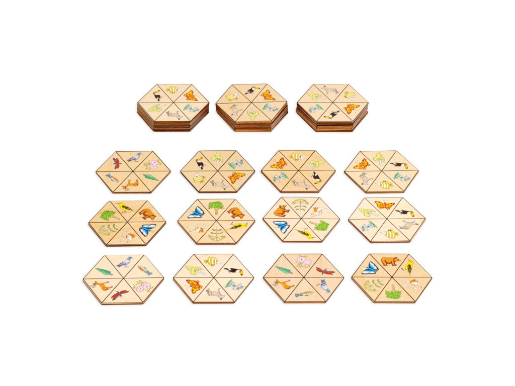 Pevná papírová krabice (21 x 12 x 6 cm) s magnetickým klipem obsahuje 30 dřevěných šestihranných destiček s obrázky (9,5 x 9,5), Dřevěný stojan a návod (AJ, NJ, NL).