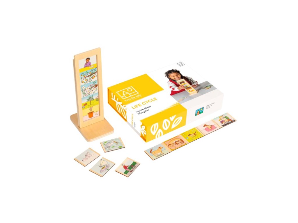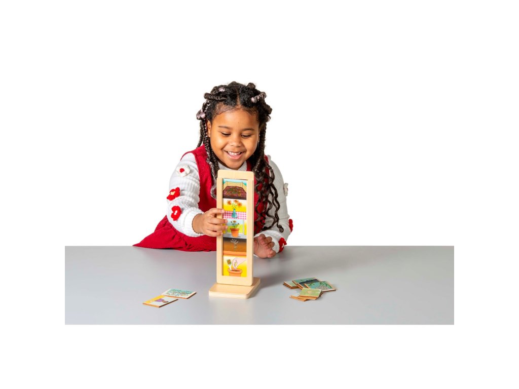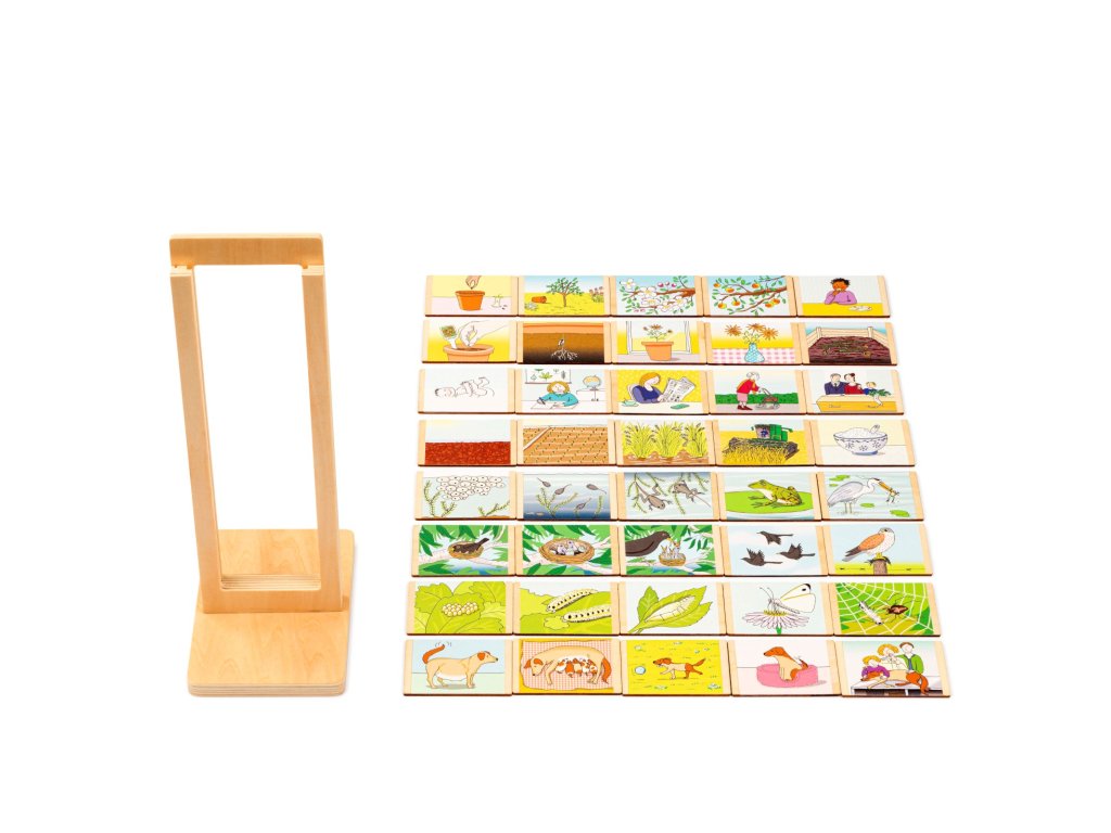 Děti umisťují obrázky do dřevěného stojanu ve správném pořadí, jak se vyvíjejí v čase.