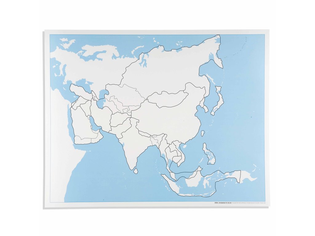 Mapa s nepopsanými státy Asie. Lze používat s materiálem Puzzle – Asie (# 0176G0), Kontrolní mapa Asie (# 554500), Popisky – Asie (# 556000) a Karty s vlajkami asijských států (# 570200).Doplňkové parametry